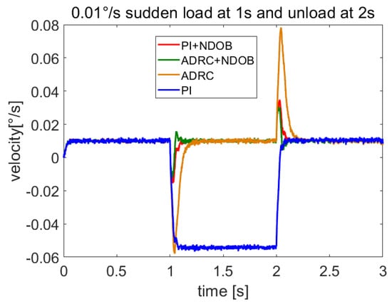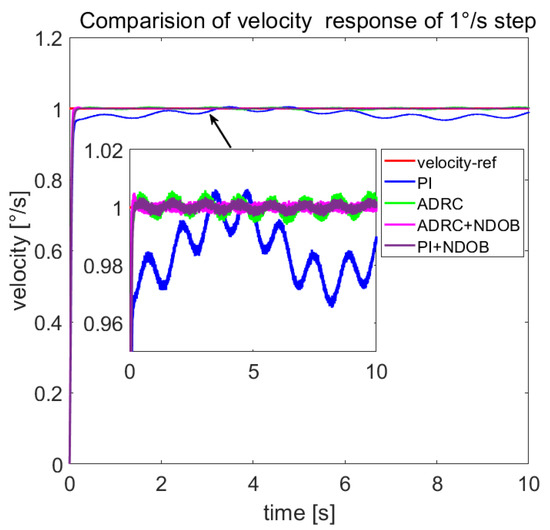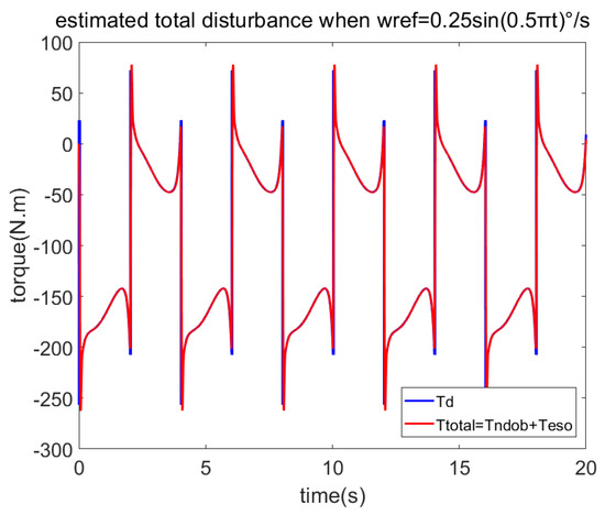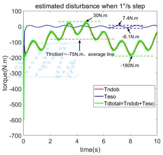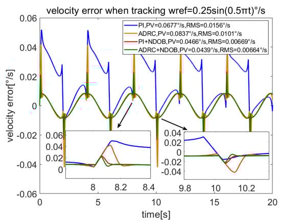 In order to verify the anti-disturbance ability of the proposed method on friction and cogging torque, let the servo system track the sine speed curve . The estimated disturbances by NDOB and ESO are shown in Figure 3, while the total load and the estimated total disturbance are shown in Figure 4. Figure 3 shows that the NDOB estimated the dominant disturbance, while ESO only estimated the residual disturbance. Moreover, Figure 4 shows that NDOB + ADRC can estimate the total disturbance well. Figure 5 compares the velocity errors of different control methods. It shows that the RMS velocity error of PI is largest, and its average value is not zero. Due to the ADRC having certain anti-disturbance ability, its error is smaller. Because PI + NDOB has further improved anti-disturbance, its error is further reduced. ADRC + NDOB has the best anti-disturbance performance of the four control methods, and the corresponding error PV value and RMS value are also the smallest.