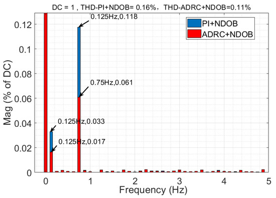 The comparison of the speed step response of the four control methods is shown in Figure 15, and the disturbance load estimated by the NDOB and ESO is shown in Figure 16. Figure 16 shows that the total disturbance estimated by NDOB + ADRC and the NDOB estimates the dominant disturbance, which ranges from −180 N·m to 30 N·m, while the ESO estimates the residual disturbance, which ranges from −6.1 N·m to 7.4 N·m. It can be observed that the average value of the estimated load is −75 N·m, which should be the friction torque, deducing that the amplitude of the cogging torque is about 105 N·m. As shown in Figure 14, the four control methods have approximate rise times but different steady-state responses. The PI method has the largest speed fluctuation, and the ADRC + NDOB method has the smallest speed ripples, thus exhibiting the best disturbance rejection of friction and cogging torque. The speed harmonics analyzed by FFT are shown in Figure 17. When the tracking speed is , the frequency component corresponding to the number of pole pairs is 0.125 Hz, while the frequency component corresponding to the number of stator slots is 0.75 Hz, which matches Figure 17. Compared with PI + NDOB, the speed harmonics component of 0.125 Hz and 0.75 Hz of ADRC + NDOB was reduced by about 48%. At present, the 2.5-m telescope is still in the laboratory, so it has not been tested under wind disturbance.