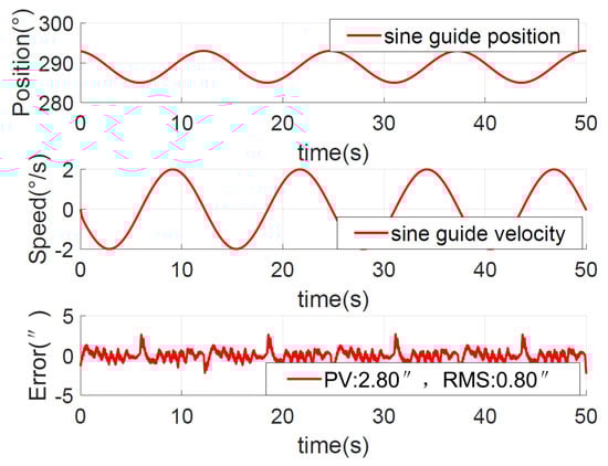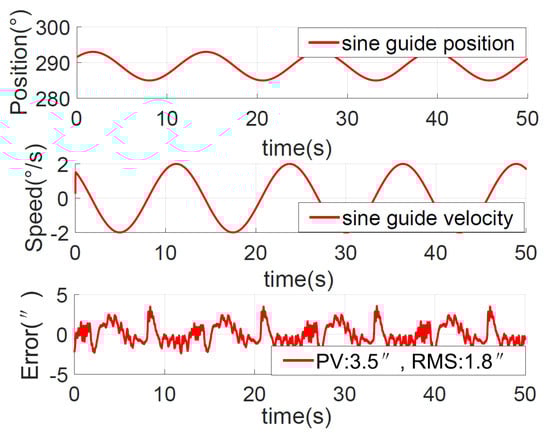 To verify the fast tracking performance, equivalent sinusoidal guidance was performed with a velocity of and an acceleration of , that is, . The position, speed, and error curves of the ADRC + NDOB and PI + NDOB methods are shown in Figure 18 and Figure 19, respectively.