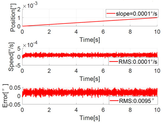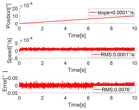To verify the ultra-low-speed tracking performance, a position curve with a slope of is used as a guide, that is, . The position, speed, and error curves of the ADRC + NDOB and PI + NDOB are shown in Figure 20 and Figure 21, respectively. As can be seen from the figures, the error RMS value of ADRC + NDOB is , and the error RMS value of PI + NDOB is . It can be seen that ADRC + NDOB has smaller ultra-low-speed tracking error and higher tracking accuracy than PI + NDOB.
