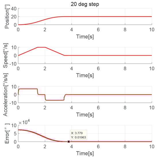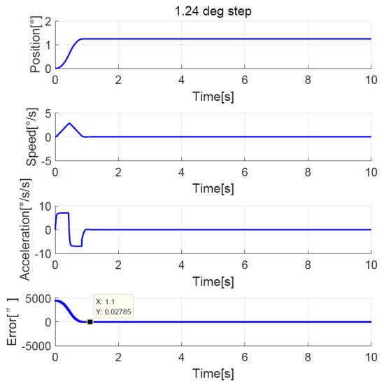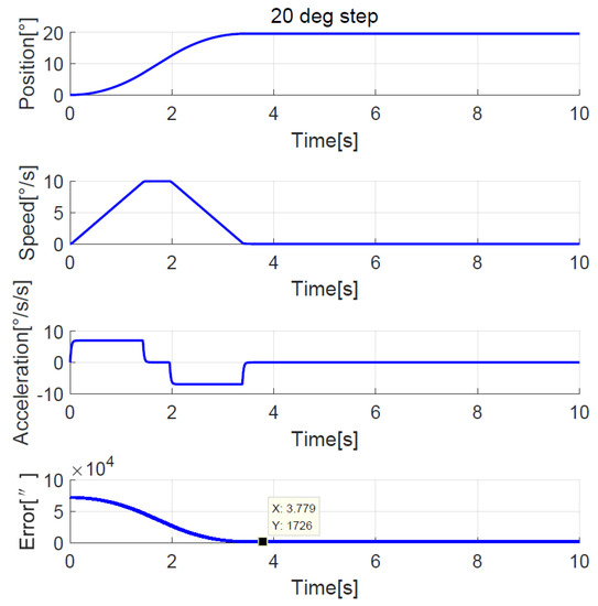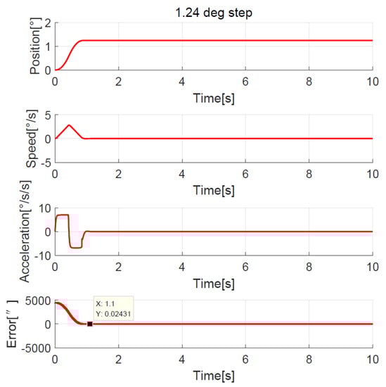 The simulation showed that the transition process was bad without the NTD, so here we only compare the experimental results between the improved NTD and conventional NTD. The parameter settings of the improved NTD are exactly the same as the simulation. The conventional NTD had the same speed factor r as the improved NTD but without considering the speed upper bound allowed by the telescope, its maximum value of the speed is closely related to the step set value p0, that is, . When the ADRC + NDOB is adopted and the transition process is planned by the improved NTD and conventional NTD, respectively, the improved NTD’s step response curves of FOV and are shown in Figure 22 and Figure 23, respectively. The conventional NTD’s step response curves of FOV and are shown in Figure 24 and Figure 25, respectively. It can be seen from Figure 22 and Figure 23 that the improved NTD’s results are almost consistent with the simulation, which verifies the effectiveness of the improved NTD in achieving a fast and smooth transition process. In Figure 24, the conventional NTD was not affected by speed saturation when a small step response such as FOV was used because . But when a step response is used, as in Figure 25, since , the planned speed and position do not match, resulting in the final steady-state error of about 1726 arc-seconds.