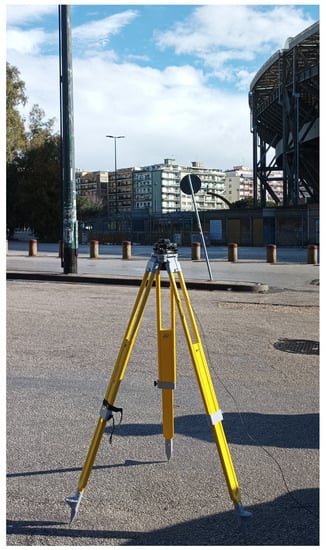 The data collection site is located in Naples, Italy; this scenario is expected to be a quasi-open-sky and low-multipath environment, as shown in Figure 1. The first data collection session employs a single u-blox ZED-F9P GNSS low-cost receiver connected via SubMiniature version A (SMA) cable to the u-blox ANN-MB low-cost active GNSS antenna [34]. The experiment consisted of a static survey on a point of known coordinates. The data collection refers to a 2.5 h GNSS acquisition in the L1/E1, L2, and L5/E5b bands, carried out on 23rd of December 2022. To guarantee data repeatability, all data collections were interspersed by 861,540 s (about 10 days); hence, the satellite geometry perfectly corresponds [35]. This is verified for all satellites, except for the Galileo E14 and E18 satellites that, due to their very eccentric orbit, exhibit a repeatability of about 20 days [36]. The software employed for data logging and reception of PPP-RTK corrections was the u-blox proprietary evaluation software, known as U-center version 22.07, released on August 2022. Regarding the PPP-RTK data correction service, the commercial service released by u-blox, known as Point Perfect, was evaluated. It can deliver messages both via IP or L-band exploiting the Message Queue Telemetry Transport (MQTT) protocol. Here, the IP network, receiving two types of messages in Secure Position Augmentation for Real-Time Navigation (SPARTN) 2.0 format [37], has been employed: satellite clock corrections every 5 s and satellite orbits, bias, and atmosphere corrections every 30 s. The results were analyzed by exploiting a code written in MATLAB®, developed by ourselves. This extracts some information from the binary u-blox proprietary file, e.g., high-precision positions and solution status, among others. During the experiment, the receiver was switched off and restarted (hot start) to simulate signal leakage, going along with a statistical evaluation of the convergence times the system needs to resolve the phase ambiguity at integer values: 60 consecutive hot starts were imposed, interspersed with one minute of fixing maintenance. According to the u-blox integration manual, in hot start mode, the receiver simulates a short-time shutdown (4 h or less), so that its ephemerides are still valid. This strategy leads each time to the receiver starting a new ambiguity search. Given that the Point Perfect data correction service delivers the corrections in ITRF2014 (current epoch), a transformation was performed to consider the relationship of the ETRS89 with the International Terrestrial Reference System (ITRS), allowing the comparison between the ground truth and the PPP-RTK solutions.