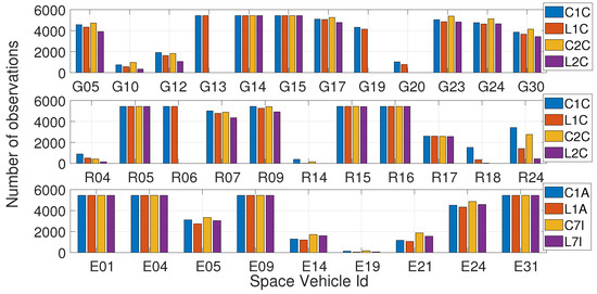 The number of observations stored for each satellite on both frequencies has been analyzed, as reported in Figure 3. In particular, the top panel refers to GPS satellites, the middle panel refers to GLONASS satellites, and the bottom one to Galileo satellites. Code and phase observables for the first frequency are represented by blue and red bars, respectively. Code and phase observables for the second frequency are represented by yellow and purple bars, respectively. The figure shows that the receiver was not able to construct the observables on the second frequency for some satellites, namely G13, G19, G20, and R06. Furthermore, for satellites R18 and R24 the number of observables on the second frequency is abnormally low. The GPS satellites listed earlier, belong to the Block IIR launched between 1997 and 2004. These satellites transmit C/A code on the L1 band and precise P(Y) code, both on L1 and L2 bands. Thus, as specified in Section 3, the ZED-F9P GNSS module cannot receive the signals transmitted by GPS Block IIR satellites on the L2 band. Therefore, those could only be acquired with single-frequency observations. During data collection, 12 GPS satellites were in view, 3 of which belong to Block IIR satellites (G13, G19, and G20). To summarize, the receiver managed to track: 12 GPS satellites (9 both on L1 and L2 frequencies), 11 GLONASS satellites (10 both on L1 and L2 frequencies), and 9 Galileo satellites (all of them both on E1 and E5b frequencies).