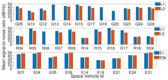 Subsequently, the signal-to-noise ratio (SNR) analysis was conducted. Figure 4 reports the mean SNR for GPS (top panel), GLONASS (middle panel) and Galileo (bottom panel) observations acquired by the receiver. Figure 4 suggests that the mean SNR for E1 Galileo frequency is similar to that on E5b, whereas GPS L1 mean SNR is often higher than GPS L2 band. It can be observed that the Galileo E19 satellite’s mean SNR is lower than others; this is explained by considering that this Galileo satellite belongs to the In-Orbit Validation (IOV) Block. Indeed, all IOV satellites were backed-off after the failure of the E20 satellite, which resulted in their signals having less transmitted power than the Full Operational Capability (FOC) satellites.