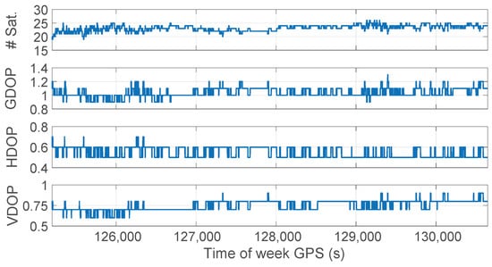 The accuracy of the position solution depends on several factors, such as the number and geometry of visible satellites, the accuracy of satellite clocks, and atmospheric conditions. The dilution of precision (DOP) is a quantitative measure of how these factors affect the accuracy of the position solution. Figure 5 depicts the time evolution of the number of satellites in view, the GDOP (Geometric Dilution Of Precision), the HDOP (Horizontal Dilution Of Precision), and the VDOP (Vertical Dilution Of Precision). The figure illustrates that the survey was conducted in excellent conditions for both satellite geometry and horizontal and vertical accuracies.