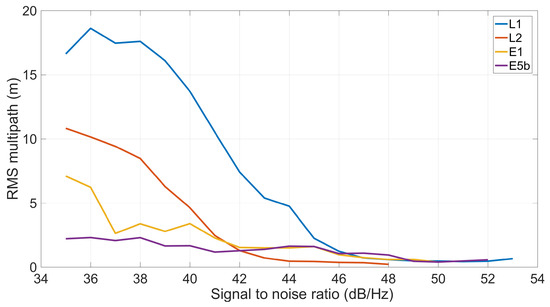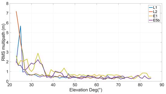 Figure 6 shows the RMS of multipath error of L1, E1, L2, and E5b signals as a function of satellite elevation. To represent the data in the figure, a mask angle of 25 has been used given that the multipath errors under this mask angle were one order of magnitude higher. It is worth noting that round brackets indicate that the value is not included in the interval whereas square brackets indicate that it is included.