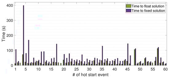 Figure 9 reports the times taken by the low-cost receiver for float and fixed ambiguity estimates after each hot start imposed. During five events (3, 18, 19, 47, and 55), the receiver was unable to resolve the phase ambiguity at integer values; therefore, when this happens, a hot start was imposed after a pre-established time. During event 4, the receiver needed about 400 s to resolve the ambiguity at integer values. Moreover, within event 47, it is worth noting that the receiver was unable to even resolve the phase ambiguity at float values, resulting in the need to restart the software. As far as this is concerned, throughout the experimentation some software malfunctions and bugs came out. The results obtained are outperforming if compared with those achieved by Naciri et al. [19] that applied Galileo HAS correction in static mode obtaining a convergence time of about 6 min.