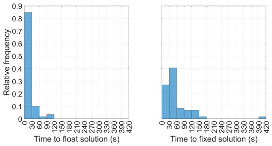Figure 10 reports the histograms indicating the relative frequencies of the time to obtain the PPP-RTK float and the fixed solutions. In the (0, 30) s interval the 85% of events reached the float solution with an average time (on all samples) equal to 21.8 s whereas in the (0, 60) s interval the 68% of events reached the fixed solution with an average time (on all events) of 59.4 s.