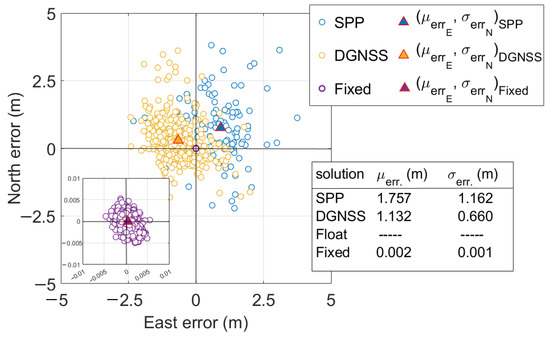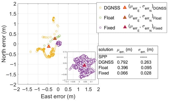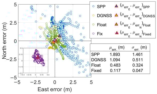 Figure 15 shows the scatter plot of horizontal positioning errors in RTK mode. The figure reports mean horizontal errors and corresponding standard deviations. It could be noted that mean horizontal errors were equal to 1.757, 1.132, and 0.002 m for SPP, DGNSS, and RTK fixed solutions, respectively; the corresponding standard deviations were equal to 1.162, 0.660, and 0.001 m. Inside Figure 15, on bottom-left, has included a zoomed-in figure to provide a closer view of fixed solutions for a better readability.