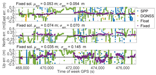 Figure 12 shows the East, North, and Upward error components over time for all the types of solutions. The restarts imposed can be clearly identified. Mean errors of fixed solutions, as reported in each panel of Figure 12, were equal to 0.053, 0.074, and 0.035 m for the East, North, and Upward components; the corresponding standard deviations were 0.054, 0.070, and 0.145 m. As specified above, during five events, no fixed solution was achieved; hence, in correspondence of these events, no purple marker is shown in Figure 12.