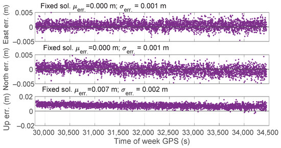 Figure 16 shows the East, North, and Upward error components over time in RTK mode for all the types of solutions. Mean errors of RTK fixed solutions (also reported in each panel of the figure) were almost zero for the East and North components ( and m, respectively), whereas attested to 0.007 m for the Upward component; the corresponding standard deviations were equal to 0.001, 0.001, and 0.002 m.