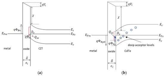 where µn is the electron mobility and Ec is the electric field at the cathode, which is assumed to depend linearly on the reverse bias voltage. The parameter C2 characterizes the voltage drop across the interfacial layer, C2 V, which gives the additional barrier height lowering. C2 is assumed to be independent by the temperature [29]. When the density of surface states Ds → ∞, then C2 → 1, and in this case the Fermi level at the interface is pinned at a value Φ0 above the valence band by the surface states and the barrier height seen by electrons is ϕBn = Eg − Φ0, where Eg is the band gap of the semiconductor. In this case, the barrier height is independent of the metal work function. When Ds → 0, ϕBn = φm − χ, where φm is the metal work function and χ the electron affinity of the semiconductor. Typical C2 values in CZT detectors are of the order of 10−5 and 10−4 [15,29,31,32]. Figure 1 shows the simplified schematic diagrams of the metal/n-CZT (a) and metal/p-CdTe (b) interface, at thermodynamic equilibrium.