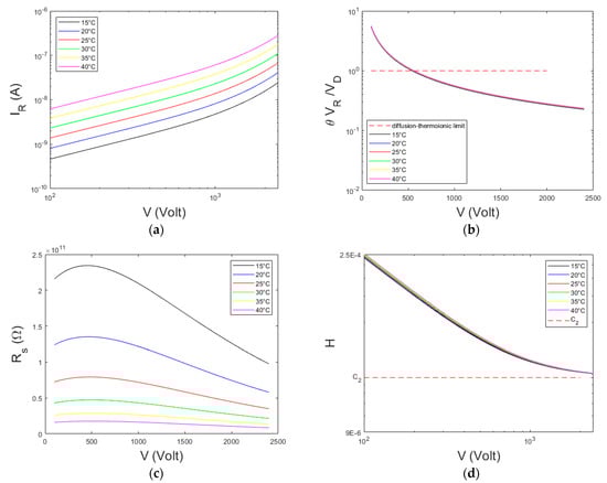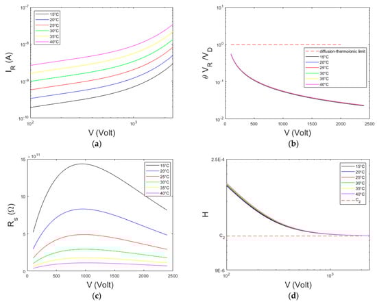 (a) Calculated I−V curves following the ITD model (Equation (1)) for a Pt/CZT/Pt detector (Table 1). (b) The ratio θ VR/VD vs. the voltage, (c) The Rs−V curves. (d) The calculated H−V curves. The results are presented at different temperatures and by using a transmission coefficient θ = 0.05.