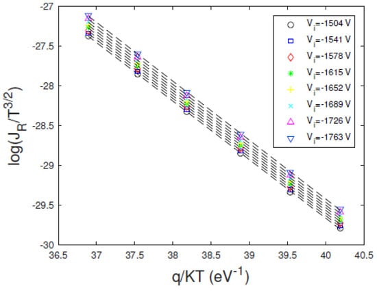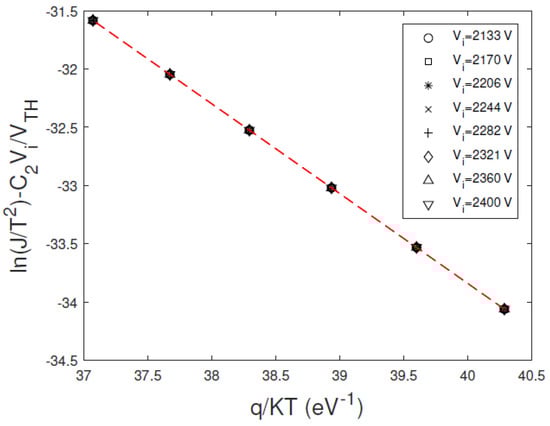 Figure 9 shows the Arrhenius plots of ln(J/T2) − C2V/VTH versus q/KT, obtained at different bias voltages, properly selected in the plateau zone of the related H–V curves (Figure 8). The linear behaviour is visible, and quite good independence from the voltage is generally observed. The barrier height φB0 and the transmission coefficient θ values were calculated from the Arrhenius plots at all voltages located in the plateau zone. For each voltage, we calculated the parameter values and their errors (95% confidence interval) though a weighted linear best fitting. In Table 4 are reported the weighted mean values of the parameters over the selected voltages.