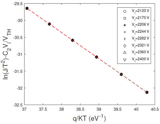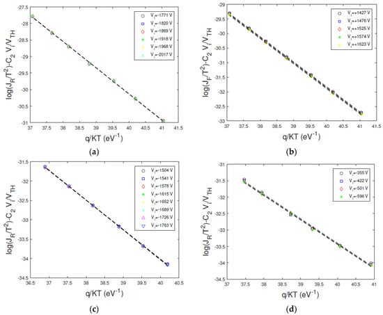 Calculated Arrhenius plots of ln(J/T2) − C2V/VTH versus q/KT, at different bias voltages. The voltages belong to the voltage range where the H–V curve reaches a quasi-plateau. We used a transmission coefficient θ = 0.5.