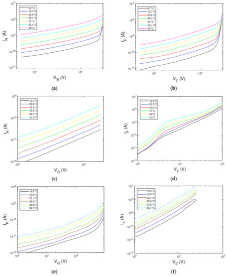 Figure 6 shows the I–V curves of the investigated detectors at different temperatures, measured in reverse (left column) and forward (right column) biasing. The D1 detector (Au/LF-CZT/Au, electroless deposition) is characterized by quasi-symmetric current curves, typically observed in Au/CZT/Au detectors with electroless contacts [15,32]. At low voltages, the current follows a power law trend ∝ Vb, with b = 0.8 in reverse (Figure 6a) and b = 0.9 in forward (Figure 6b). At high voltages the current increases with a higher slope (b > 2), both in reverse and forward, typical of the space charge limited current (SCLC) regime [32]. The starting voltage of the SCLC regime depends on the temperature. The D2 detector (Pt/HF-CZT/Pt, sputter deposition) shows asymmetric I–V curves, typical of CZT detectors with sputter Pt contacts [7], with forward-biasing currents (Figure 6d) higher than the reverse-biasing ones (Figure 6c). The transport mechanism in reverse is governed by a reversed-biased Schottky barrier, with the ITD model able to be applied. The reverse current follows a trend ∝ V at all temperatures, typical of the diffusion mechanism. Asymmetric I–V curves were also measured for the D3 detector (Al/CdTe/Pt), in agreement with the well-known rectifying properties of Al/CdTe/Pt detectors [18,19,41]. At reverse voltages less than 100 V (Figure 6e), the currents follow the trend ∝ V1.2; at higher voltages, the I–V curves are characterized by exponential behaviour due to the barrier-lowering effects. The forward currents (Figure 6f) are higher than the reverse ones, showing the typical trend of forward-biased diodes with an ideality factor depending on the voltage [21]. We applied our approach to the reverse currents for all detectors; the forward currents of the D1 detector will be only analyzed.