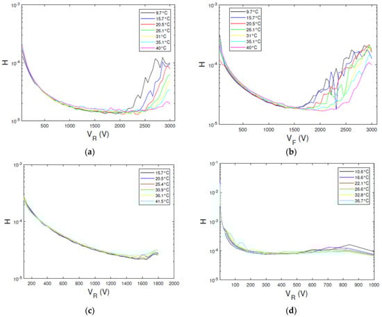 The experimental H function values versus the bias voltage are shown in Figure 8. Generally, the H–V curves follow the expected behaviour from the ITD model. The curves are quite independent on the temperature, showing decreasing values with voltage and reaching a plateau at high voltages. The H function of the D1 detector reaches a plateau between 1500–2000 V and 1400–1600 V in reverse and forward biasing, respectively. The ITD model fails at high voltages, where a marked dependence on the temperature is observed (SCLC regime). A plateau is also obtained for D2 and D3 detectors (at about 1500 V and 300 V for D2 and D3, respectively), showing a low temperature dependence.