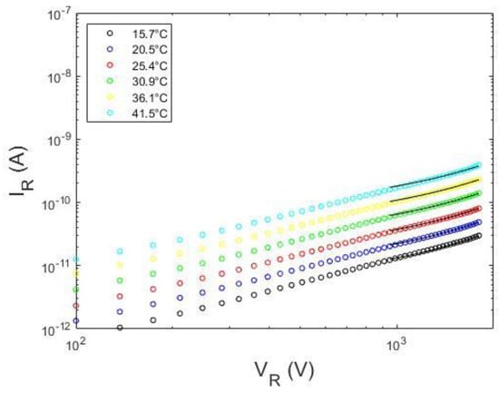 To strengthen the results obtained from our approach, we modelled the experimental I–V curves with the ITD model (Equation (1)) by using the parameters (θ, C2, φB0) estimated with the H function method. The results, related to the D2 detector, are shown in Figure 10. A good agreement between the data and the ITD function was obtained. The modelling at lower voltages (<1000 V) requires further details about the expression of VD (Equation (2)).
