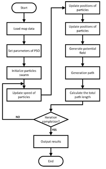 The potential field, in turn, generates a force and the robot moves in the direction of the combined force. APF is widely used in path planning because of its simple mathematical principle, low computational effort, high real-time performance, low hardware requirements, fast response time, and the ability to form closed-loop control for path generation and motion control with the working environment. In this study, the potential field of robot movement on the map was considered to be established first, and then rPSO was used for path planning. Therefore, a particle swarm path-planning algorithm for mobile robots based on an artificial potential field (apfrPSO) was proposed.