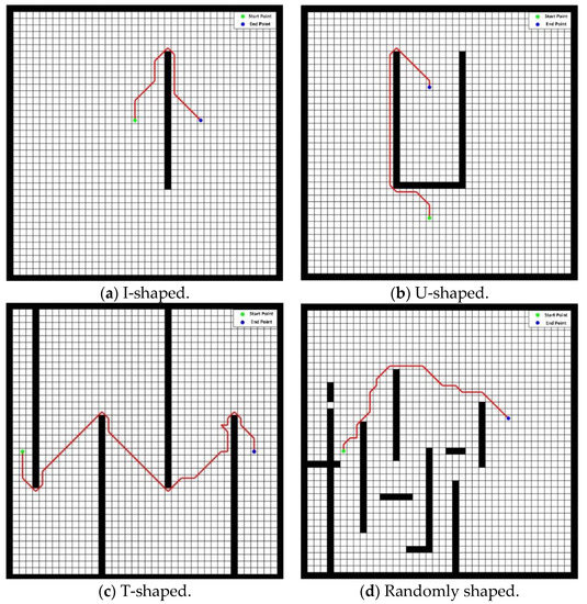 In this study, we used the raster method to model the environment of the path-planning space of the mobile robot and artificially set four types of obstacles (as shown in Figure 3 below). We set the location of the target starting point and the target ending point and observed whether the algorithm combining APF and PSO could meet the requirements and whether the path taken could avoid the set obstacles.