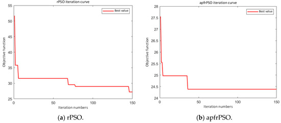 First, the convergence performances of the two algorithms were compared and analyzed for the stochastic environment. As can be seen in Figure 5, the apfrPSO algorithm not only converged in a faster time but also obtained shorter paths in the path-planning problem compared with the rPSO algorithm. This meant that the apfrPSO algorithm had better convergence and global optimality search compared with the rPSO algorithm.