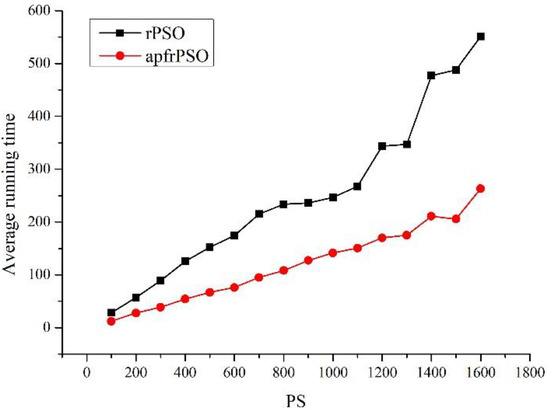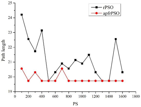 The relationships between the path length, average running time, and population size of apfrPSO in Figure 6 and Figure 7 show that the optimization capability was saturated after the population size reached a certain level and the path length cannot be further optimized, and thus, if the population size is increased at this time, it will make the algorithm run longer. Therefore, when designing a specific algorithm, the population size should be chosen reasonably so that a better result can be achieved in a shorter time.