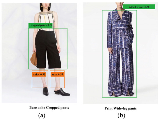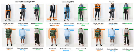 There are two primary methods for object detection: closed-set object detection, which can only detect known categories in a dataset, and open-set object detection, which can detect arbitrary objects specified by human language input. This paper addresses the challenges faced by these methods in the fashion image domain and introduces a new garment object detection benchmark, Garment40K. Closed-set object detection models such as Mask R-CNN [4] and DETR [5] are limited by their reliance on additional annotated data to generalize to new visual concepts and domains. In the fashion image domain, these models encounter difficulties due to fine-grained categories and the lack of extensive annotated data for training large-scale models. Conversely, open-set object detection algorithms, like ViLD [6], leverage visual and linguistic knowledge distillation techniques to align textual and image embeddings, surpassing supervised models of the time. Building upon these foundations, GLIP [7] unifies object detection and phrase grounding as pre-training tasks, learning object-level, language-aware, and semantically rich visual representations. Grounding DINO [8], a recently proposed model, inherits GLIP’s advantages, optimizing end-to-end detection without complex modules and demonstrating state-of-the-art object detection performance. However, these models still exhibit inaccuracies during inference, particularly in the fashion image domain, where they struggle with zero-shot detection and misidentification. The performance limitations of Grounding DINO are markedly illustrated with the examples depicted in Figure 1a,b. The model demonstrates a marked susceptibility to confusion when processing a fashion dataset, a phenomenon that is not uncommon and is worthy of closer examination. In the instance outlined in Figure 1a, Grounding DINO is easily misled by text, identifying “ankle” and “cropped pants” for “Bare ankle cropped pants” without grasping the semantic essence. The situation escalates in Figure 1b, where the model inaccurately encapsulates the entire model, evidencing its propensity for disarray when confronted with identical styles of apparel, such as tops and pants. The root of these issues can be traced back to the datasets used for pre-training these models. Inherently exhibiting a long-tail distribution, these datasets create a deficit in the model’s understanding of images related to the fashion domain. This shortcoming is further compounded by the inferior quality of many text descriptions in large-scale image–text datasets. Despite their extensive lexical range, these datasets enhance the model’s vulnerability to linguistic obfuscation, leading to further inaccuracies in image recognition and interpretation.