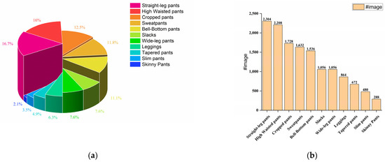 Comparative analysis of different types of pants in the dataset. (a) The bar chart showcases the absolute quantity of each type of pants in the dataset; (b) the pie chart displays the relative percentage distribution of the various types of pants.