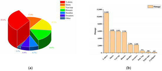 Comparative analysis of different types of tops in the dataset. (a) The bar chart represents the absolute quantity of each type of top in the dataset; (b) the pie chart illustrates the relative percentage distribution of the different types of tops.