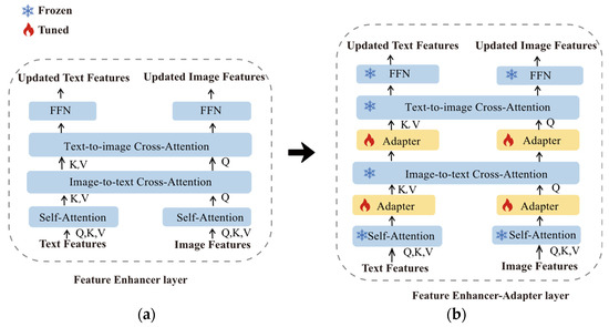 The adapter [9] features a bottleneck architecture composed of two fully connected (FC) layers and an intermediate GELU activation layer. The first FC layer projects the input to a lower dimension, while the second FC layer reverts it back to the original dimension. Within the Grounding DINO architecture, a critical constituent is the feature enhancer network, which originally solely consists of the stacked feature enhancer layer, as depicted in Figure 6a. In order to perform effective fine tuning, we made improvements to the feature enhancer layer: First, we introduced an adapter following both the text self-attention layer [25] and the image self-attention layer [26]; subsequently, we integrated two parallel adapters for image-to-text cross-attention. As illustrated in Figure 6b, we term this feature enhancer–adapter layer. The computation for the feature enhancer–adapter layer can be formulated as follows: