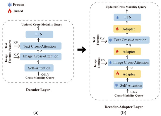 Within the Grounding DINO architecture, another critical component is the cross-modal decoder, which originally only consists of the decoder layers depicted in Figure 7a. We made the following improvements to it: We successively integrated three adapter modules, and these were sequentially placed after multi-head self-attention, image cross-attention, and text cross-attention, respectively. As illustrated in Figure 7b, we refer to this arrangement as decoder–adapter layer. The computation for the decoder–adapter layer can be expressed as follows: