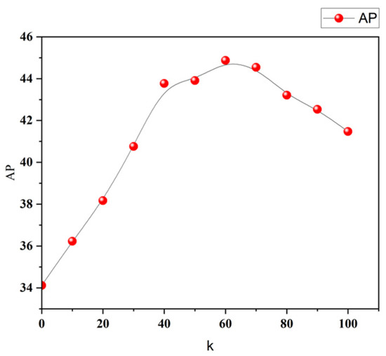 Relationship between hyperparameter k and AP. The graph illustrates the influence of different k values on the model’s accuracy. An optimal k value, approximately around 50, is observed, beyond which the model’s accuracy begins to deteriorate.
