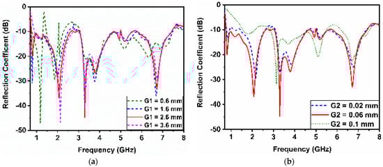 The effect of the spacing between the open-ended edge of the monocone and the grounded ring is examined by varying G1 from 0.6 mm to 3.6 mm. The result indicates that in the lower frequency band regions, the spacing needs to be approximately more than 2.6 mm to avoid frequency notches in the lower frequency band. This is mainly because of the rapid changes in the input impedance imaginary part of the design with the open-edge distance variation. The separation distance (G2) between the monocone and capacitive feed varied from 0.02 mm to 0.1 mm. The simulated results show that if the gap increases to 0.1 mm, the reflection coefficient significantly degrades across the frequency range of 700 MHz to 3 GHz. As separation decreases to 0.02 mm, the return loss across the same region improves, as shown in Figure 3. This is because the capacitive feeder compensates for the inductive characteristic of the monocone.