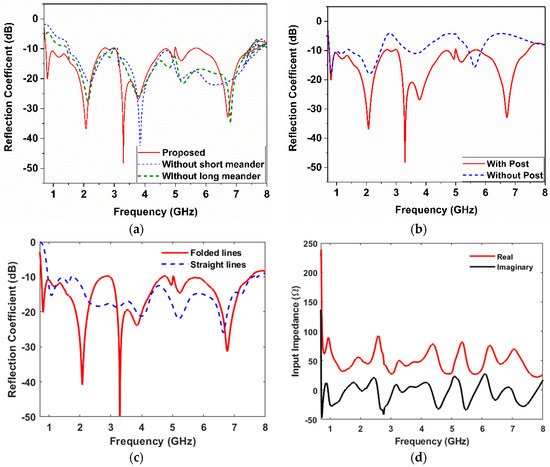 Reflection coefficient: (a) without long/short meanders, (b) with and without posts, (c) with the proposed folded and straight lines, and (d) the input impedance with meanders and posts.