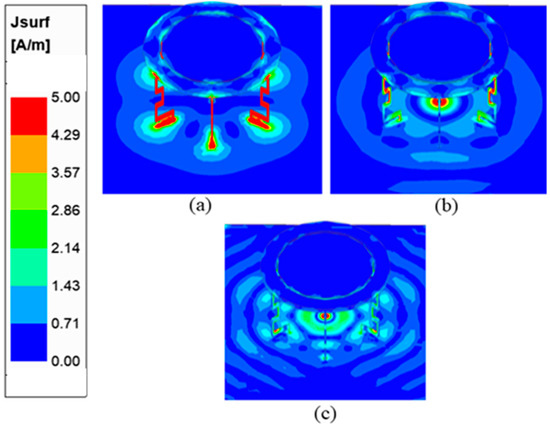 Current distribution for (a) 0.77 GHz, (b) 3.5 GHz, and (c) 5.9 GHz.
