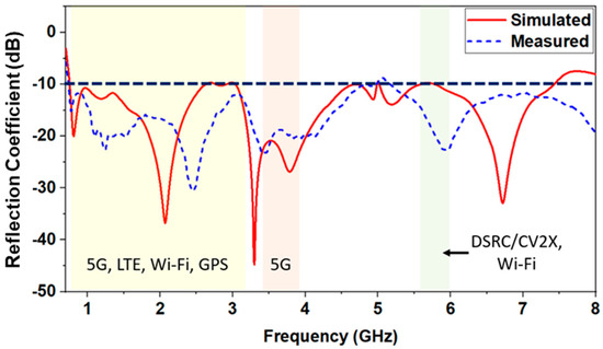 The simulated and measured reflection coefficients of the proposed antenna are shown in Figure 7. The simulation results indicate that the antenna supports an ultra-wide bandwidth covering 0.75 GHz to 7.6 GHz, with −10 dB of the reflection coefficient criteria. Some differences between the simulated and measured reflection coefficients are due to fabrication tolerance. However, they are still in good agreement. The operating band covers GSM800, GSM900, GPS, DCS/GSM1800, PCS/GSM1900, WCDMA/UMTS/IMS-2000, WiBro, LTE Band 1/2/4/7/13/17, WLAN, and DSRC/C-V2X.