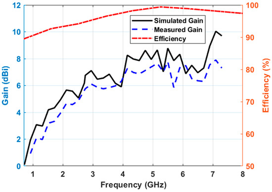 The proposed antenna was tested to validate the far-field characteristics of the antenna in the Howland Model 3500D anechoic chamber. The measured peak realized gain varied between 2 to 10 dBi at the frequency band of interest, as shown in Figure 8. The gain at the center frequency is approimately 7 dBi. The gain value is comparable to the theoretical gain value from the radiation aperture area. The antenna efficiency is above 90% throughout the operating band.