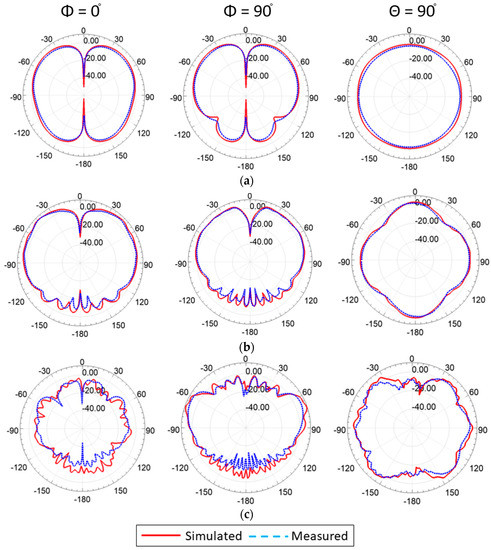 The radiation patterns were plotted in two principal planes at the representative frequencies, as shown in Figure 9. The dipole-like patterns were observed at the different frequencies near the angular range of θ = ±90°, which is required to communicate to nearby traffic infrastructure and cellular towers. In addition, at θ = 90°, the omnidirectional patterns were measured between φ = 0° to φ = 360°, ensuring full horizontal coverage to wireless connection for nearby vehicles and the power grid infrastructure. Furthermore, the cross-polarization level was found to be less than −25 dB at the lower frequency band and less than −20 dB at the higher frequency end, which is expected due to the higher-order modes’ propagation, as shown in Figure 10. The simulated and measured radiation patterns are in good agreement.
