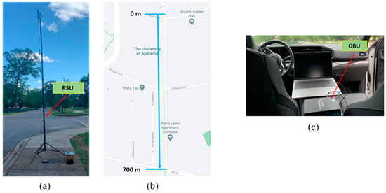 The field test was conducted along Bryce Lawn Road at the University of Alabama. This testing site features 700 m of a continuous line-of-sight (LOS) distance, as illustrated in Figure 11b. The RSU was placed at the starting position labeled 0 m, while the test vehicle with the OBU travels away from the RSU. The test vehicle was equipped with the OBU, as depicted in Figure 11c. The vehicle runs at 10 miles per hour and transmits BSMs at a rate of 10 Hz. Each BSM sent has a size of 191 bytes, consisting of vehicle positional data.