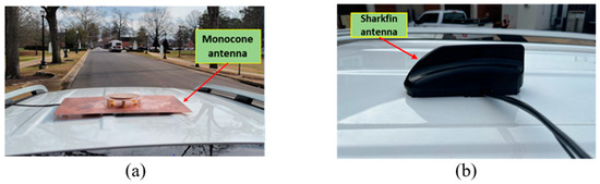 Antennas mounted on the test vehicle: (a) the proposed monocone antenna and (b) the MMXFG-5900 sharkfin-shaped antenna.