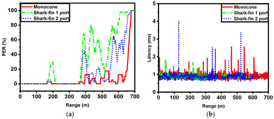 Field test results as a function of communication range for the three different antenna configurations: (a) packet error rate and (b) latency.