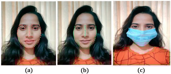 An illustration of the images indicates (a) facial landmark detection, (b) regions of interest, and (c) after applying a face mask, in the proposed study.
