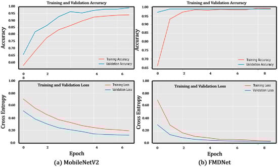 Training and validation related to the accuracy and loss of the (a) MobileNetV2 and (b) FMDNet models.