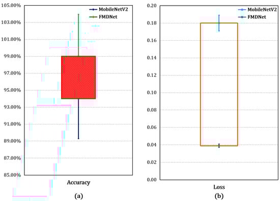 Accuracy and loss on the training dataset using the (a) MobileNetV2 and (b) FMDNet models.