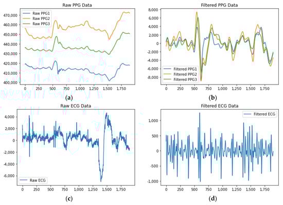Collected (a) raw PPG, (b) filtered PPG, (c) raw ECG, (d) filtered ECG, (e) raw EEG, and (f) filtered EEG data in this study. The PPG1, PPG2, and PPG3 signals represent the green, red, and infrared light captured by the sensor, respectively. Following the application of filtering techniques, both motion-related noise in PPG and noise in ECG were effectively reduced. However, there were no discernible changes observed in the EEG signal.