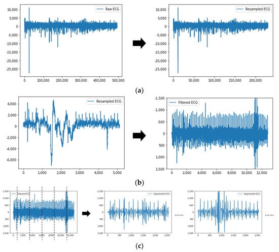 Showcase of data preprocessing procedures for a specific sample of collected ECG data. These steps include (a) down-sampling the ECG from 494,033 data points to 230,400 data points, (b) employing a Butterworth filter, (c) segmenting the data, and (d) normalizing the data.