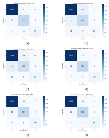 StressNeXt confusion matrix for (a) PPG as input, (b) ECG as input, (c) EEG as input, (d) combined PPG and ECG as input, (e) combined PPG and EEG as input, (f) combined ECG and EEG as input, (g) combined PPG, ECG, and EEG as input.