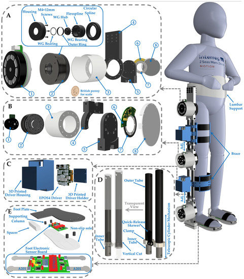 This is an overview of a novel single-leg exoskeleton designed to improve walking functionality in children with CP. (A) Exploded view of hip actuator assembly. (1) A 220 W EC 90 flat Maxon Motor. (2) A strain-wave gearbox with 100:1 reduction ratio (CPU-17A-100-M-10.15). (3) 3D-printed motor housing. (4) Hip actuator upper joint. (5) Hip actuator lower joint. (6) Rotary absolute magnetic encoder readhead. (7) Encoder magnetic ring. (8) 3D-printed encoder holder. (B) Knee actuator assembly overview. (1) A 150 W EC 60 flat Maxon Motor. (2) A gearbox with 50:1 reduction ratio (CPU-17A-50-M-8.49). (3) 3D-printed motor housing. (4) Hip actuator upper joint. (5) Hip actuator lower joint. (6) Rotary absolute magnetic encoder readhead. (7) Encoder magnetic ring. (8) 3D-printed encoder holder. (C) EPOS4 Driver structure. (D) Lower-leg tubes and transparent view. (E) Foot configuration.