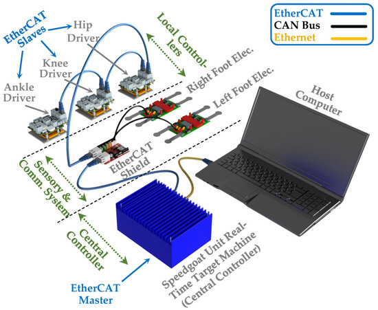 To ensure precise control of all three motors and enable real-time sensor data collection, we established the control system configuration for the SLE, as illustrated in Figure 3. The control system in the SLE is typically divided into three essential components: local controllers (EtherCAT Slaves); sensory and communication system; and the central controller (EtherCAT Master). The first part involves local controllers providing low-level control for actuators and are located on the Maxon Epos 4 drivers, which are connected serially under EtherCAT communication protocol, beginning from the ankle driver and ending at the hip driver. The second component of the control system architecture consists of a sensory and communication system designed to receive data from local controllers and FSRs installed in the feet components of the SLE and transmit control signals from the central controller to local controllers. This system communicates with local controllers via EtherCAT and FSRs through CAN Bus. Finally, we selected a state-of-the-art real-time embedded controller (Unit real-time target machine, Speedgoat, Köniz, Switzerland) as the central control unit to ensure system stability and optimize performance.