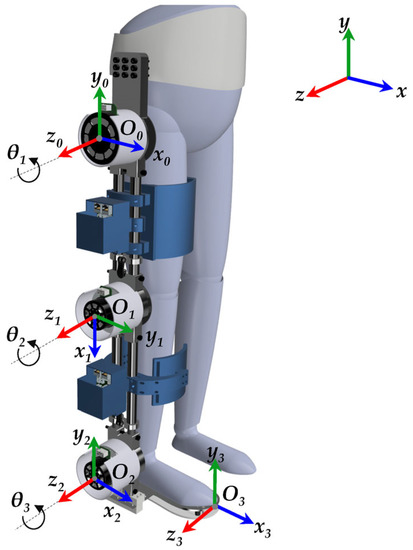 The Denavit–Hartenberg (D-H) matrix method is commonly used to derive forward kinematics [35], which provides insights into the range of motion, joint limits, and performance of the exoskeleton. Despite its lengthy and intricate mathematical process, the D-H method establishes a systematic framework for modelling the kinematics of robotic mechanisms [61]. In Figure 4, the kinematic configuration of an SLE is shown following the D-H standard form, with each link having specific frames assigned to it. In the figure presented, the starting point O0 is defined as a stationary base frame, while the terminal coordinate system O3 is denoted as the foot end effector. The kinematic transformation depicted in this figure adheres to the guidelines and principles outlined by the D-H model. This study entails the independent modelling of the exoskeleton in two distinct environments, namely Simscape and Simulink. As the two models must be compatible with each other, in Figure 4, the reference frame (X0, Y0, Z0) is chosen to be identical to the global frame (X, Y, Z), thereby ensuring consistent results using two diverse and autonomous methodologies.